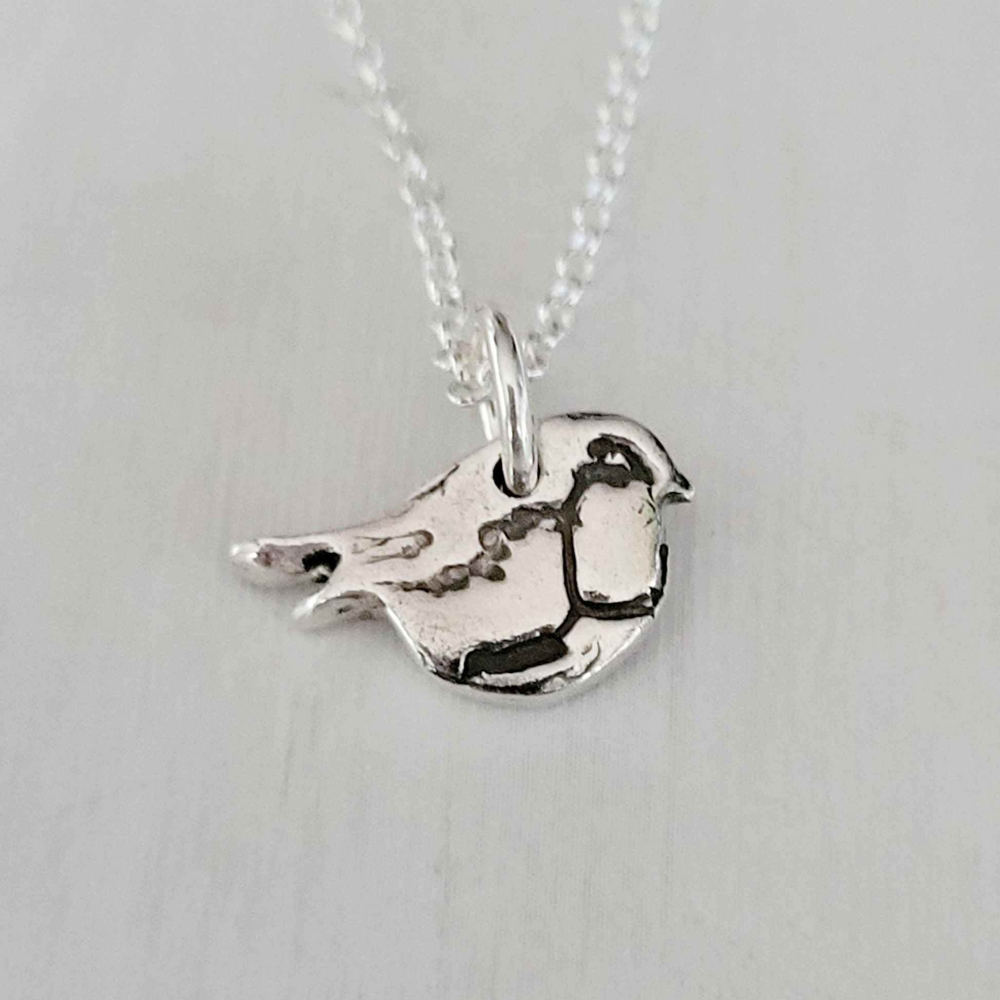 This tiny robin bird shaped sterling silver necklace is handcrafted from start to finish.